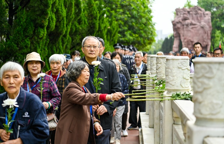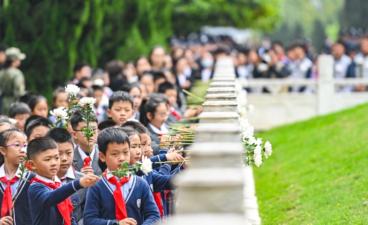 歌乐山烈士陵园松柏环绕,群雕矗立,墓前黄白菊花组成“祭”字,红白花朵组成8个花篮,鲜花簇拥着“一 一·二七死难烈士之墓”,哀乐回荡,寄托无限哀思。烈士亲属及社会各界代表手持鲜花,面向烈士墓脱帽、默哀,以表达对先烈的敬仰和缅怀之情。