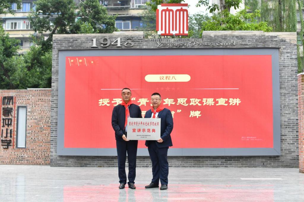 为表彰在思政课宣讲中表现突出的学生,活动举行了授旗仪式,向学生代表授予了“青少年思政课小宣讲员”旗帜,并赠送了红岩故事书籍。同时,还向杨家坪小学授牌“青少年思政课宣讲示范岗”。
