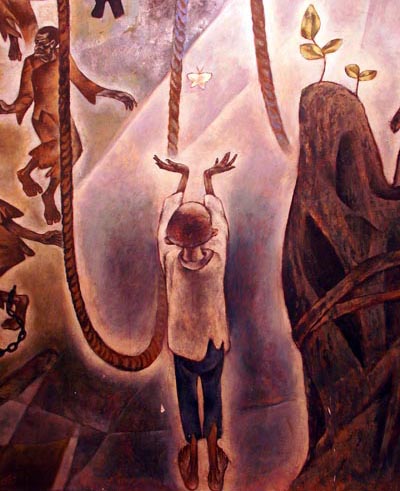大型壁画《血与火的洗礼》1986年由四川美术学院马一平教授根据《红岩》小说的故事情节创作而成。画家那浪漫的想象,优美的变形,多变的色彩,向人们展示出一部血与火、灵与肉、生与死尖锐博击的壮烈史诗。