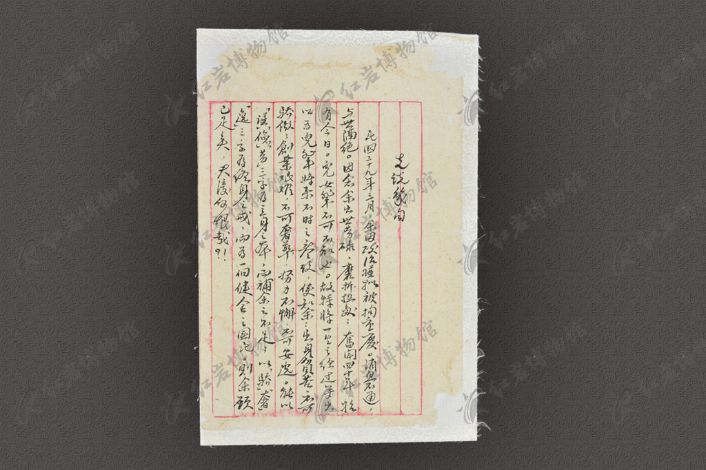 车耀先在狱中写的自传引言。26.4cm×19.8cm,2页便签纸,毛笔书写,完整、旧,贴在一张白纸上。《先说几句》是车耀先同志所写自传中的引言。四十年代初,他关在息烽监狱时,趁管理图书之便,写了长达万言的自传,概述自己的人生历程,并特地提出“谦、俭、劳”三字,谆谆告诫儿女,务必永葆革命家风。内容写道:“民国二十九年三月,余因政治嫌疑被拘重庆,消息不通,与世隔绝。禁中无聊,寝食外辄以曾文正公家书自遣。遂引起写作与教子观念。儿女辈不可不知也。故特将一生之经过写出,以为儿辈将来不时之参考。便知余:出身贫苦,不可骄傲;创业艰难,不可奢华;努力不懈,不可安逸。能以“谦”“俭”“劳”三字为立身之本,而补余之不足;以“骄”“奢”“逸”三字为终身之戒,而为一个健全之国民。则余愿已足矣,夫复何恨哉?!”捐赠者:车耀先女儿车毅英捐赠给重庆歌乐山烈士陵园收藏。
